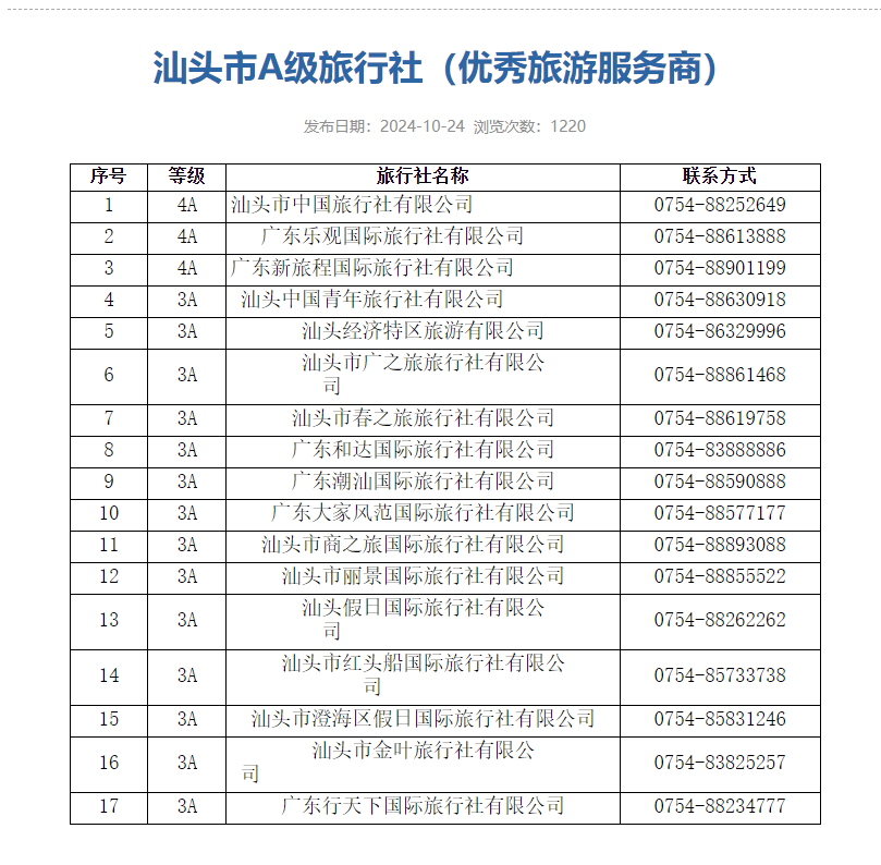 > 我社被汕頭市文化廣電旅游(體育)局榮獲~汕頭市A級旅行社(優秀旅游服務商)