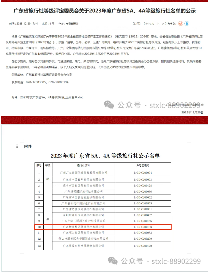 根據(jù)《廣東省文化和旅游廳關(guān)于開展2021年度全省旅行社等級評定工作的通知》(粵文旅市〔2021〕203號)依據(jù)《廣東省旅行社等級劃分與評定工作細(xì)則(試行)》等有關(guān)要求,廣東省旅行社評定委員會按照“公開、公平、公正”“優(yōu)中選優(yōu)”的原則,經(jīng)