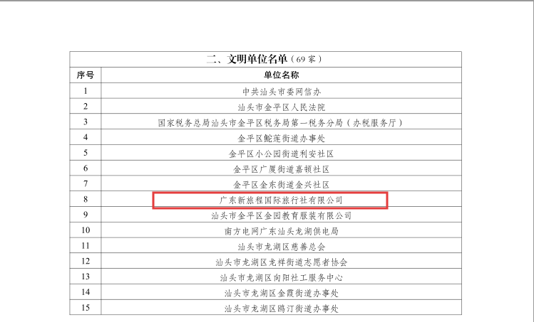 您現在的位置:廣東新旅程國際旅行社有限公司 > 旅游資訊 > 熱點資訊 > 新旅程榮獲汕頭市精神文明建設委員會2023年度文明單位